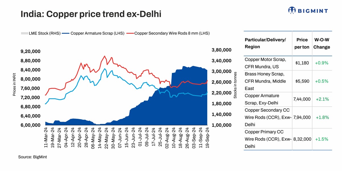 Domestic copper armature prices were assessed at INR 744,000/tonne ($8,950/t) ex-Delhi, an increase of 2.1% w-o-w. Copper futures on the London Metal Exchange (LME) recently hit a two-month high, rising to $9,550/t, reaching levels last seen in July.