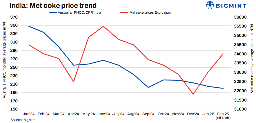 India’s domestic met coke prices remained range-bound this week. As per BigMint’s assessment, 25-90 mm blast furnace (BF) grade coke prices stood unchanged w-o-w at INR 34,000/tonne (t) exw-Jajpur, while Gandhidham’s tags were recorded at INR 32,000/t exw, up by INR 500/t w-o-w.