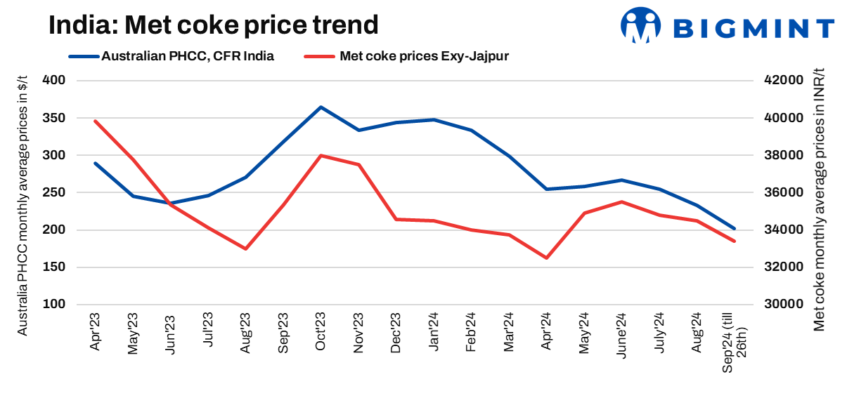 Imported met coke prices pick up: Imported met coke offers, on the other hand, went contrarion to the domestic trend. Offers rose this week. Fresh ones were heard at levels of $235/t FOB China this week as against $225/t assessed last week. Offers from Indonesia were heard at $240-245/t FoB. The imported met coke market witnessed active trades towards end of last week. Indian mills were heard to have closed two deals of 40,000t each from Indonesia. One was for October laycan and another for November at about $245/t FOB, sources informed BigMint.