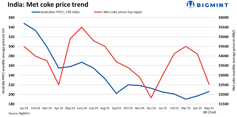 Despite rising coking coal prices, met coke prices in India are likely to remain range-bound in the near term due to muted steel demand. The steel sector’s continued underperformance is acting as a cap on potential price increases. Unless there is a substantial recovery in steel consumption or a disruption in coke supply, prices are expected to remain under pressure.