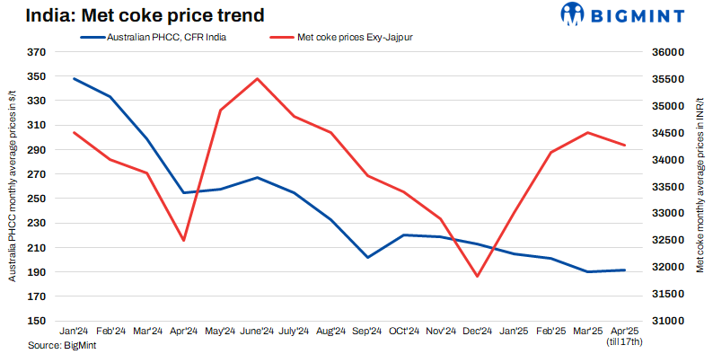 Australian coking coal prices recover after hitting 4-year low: Australian PHCC prices recovered sharply after hitting a four-year low of $166/t FOB in March 2025. As of mid-April, prices stood at $183/t FOB Australia. Prices surged due to supply concerns following accidents at Australia’s two leading mines – Moranbah North and Appin – last week.