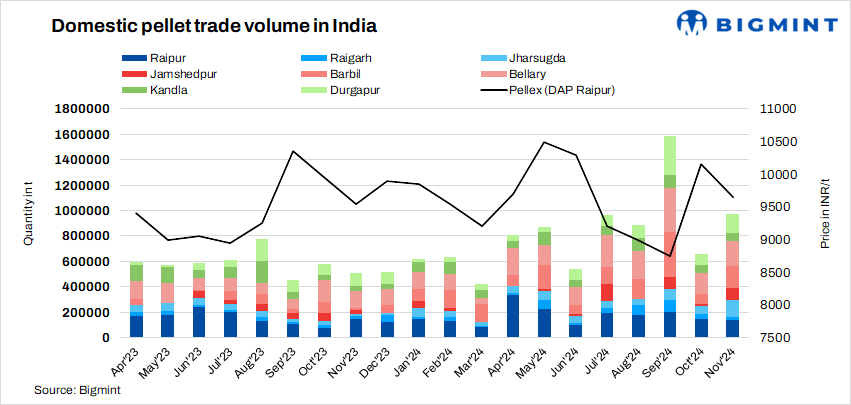 Pellet trade volumes in the Indian domestic market rose 50% m-o-m to 982,000 tonnes (t) in November 2024 from 655,000 tonnes (t) in October, according to data maintained by BigMint. This rise was mainly fuelled by restocking activities in the first half of the month and lower bids at the auction from Odisha Mining Corporation (OMC).