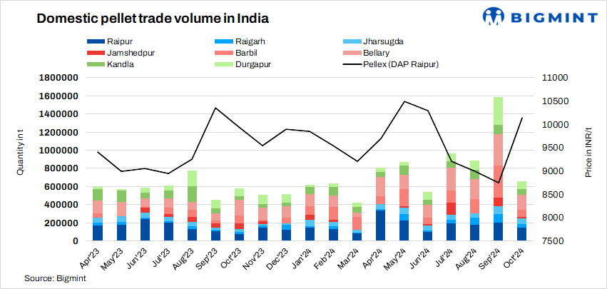 Pellet trade volumes in the Indian domestic market plummeted by 60% m-o-m to 655,000 tonnes (t) in October 2024 from 1.63 million tonnes (mnt) in September 2024, according to data maintained by BigMint. The drop was primarily driven by fluctuating demand in the sponge iron and downstream steel segments, on account of subdued market activity during the festive season.