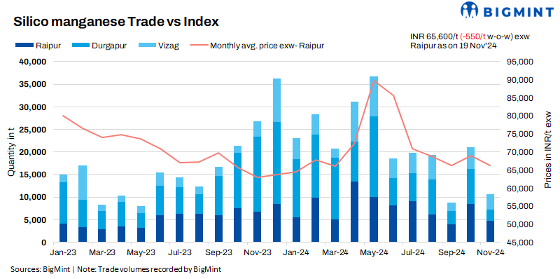 Steel demand remains slack: The domestic silico manganese market is experiencing a slowdown due to weaker demand from the steel sector. The decline in steel prices persists, with BigMint’s daily steel billet index closing at INR 39,100/t exw-Raipur on 19 November 2024, down by INR 500/t w-o-w.