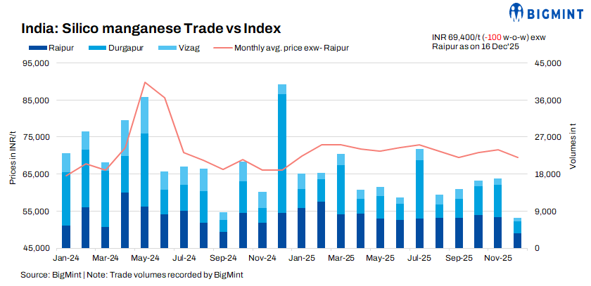 Steel prices inch up w-o-w, offering marginal relief to SiMn prices: The BigMint billet index rose by INR 300/t ($4) w-o-w to INR 36,800/t ex-works Raipur on 17 December 2025, supported by a modest improvement in buying activity and positive cues from the sponge iron market. Trading momentum strengthened in the latter half of the session, lifting billet demand and trade volumes. However, sentiment in the finished steel segment remains cautious, with buyers awaiting clearer recovery signals, which has provided limited but steady support to domestic silico manganese prices.