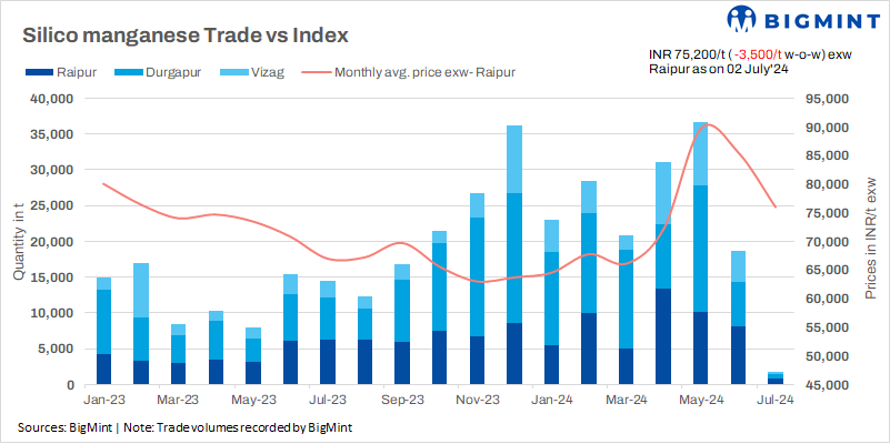BigMint’s assessment on 2 July exhibited a sharp decline in prices by around INR 2,200-3,300/t ($38-$46/t) for grade 60-14 silico manganese in comparison with 25 June, 2024, Prices fell across key regions like Raipur, Durgapur, and Vishakhapatnam. This decline brings prices to around INR 75,000-75,300/t (USD 921-940/t) ex-works, reaching a two-month low, according to BigMint’s data.
