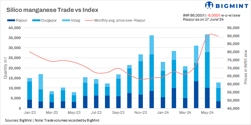Domestic silico manganese prices in India fell this week. Weak market preference for lower-priced transactions led to a w-o-w decrease of around INR 5,700/t ($68/t) in key regions. This downfall in the prices occurred because of the poor domestic demand and rigidity towards higher quotes in the market.