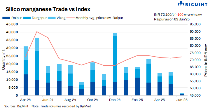 India’s silico manganese prices remained largely stagnant w-o-w, with a marginal decline of INR 100/tonne (t) ($1/t) to approximately INR 71,400-72,100/t ($830-838/t) exw as of 3 June 2025, according to BigMint’s latest assessment. The price stability reflects softening demand in the steel segment, which kept alloy buyers cautious and market sentiment subdued. Meanwhile, market participants awaited the impact of MOIL’s price reductions for manganese ore in June 2025.
