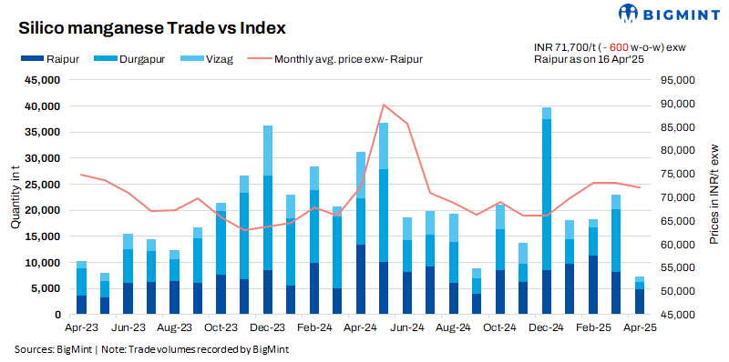 Steel billet prices fall w-o-w: Fluctuations in domestic steel prices have led to a slowdown in the silico manganese market due to weaker demand from the steel sector. BigMint’s daily steel billet index closed at INR 41,200/t exw-Raipur on 16 April, down by INR 200/t w-o-w.