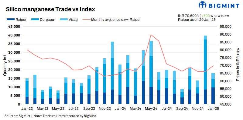 According to BigMint’s assessment on 29 January 2025, India’s domestic prices of 60-14 grade silico manganese inched by INR 300/t ($4/t) w-o-w ranging at around INR 69,800-70,800/t ($806-819/t) exw, as per BigMint’s assessment. Some smelters in Raipur and Vizag offered material at slightly higher levels of INR 70,500-71,000/t ($815-$826/t) exw, while few deals were reported on the higher side as well.