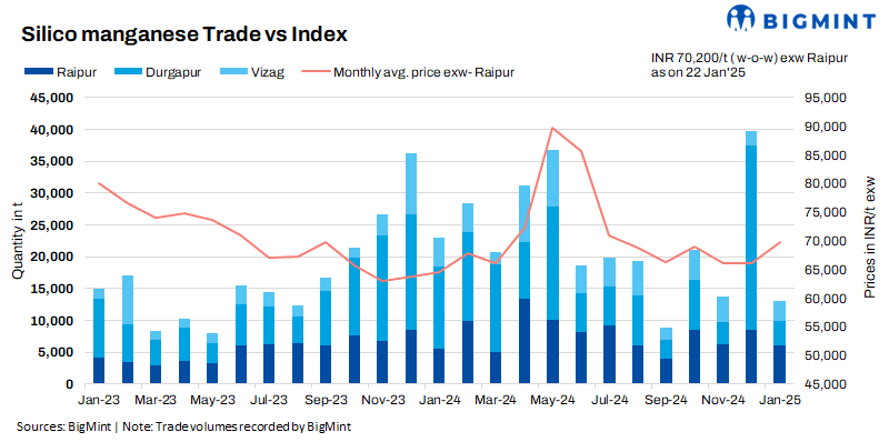 Export prices edge up amid supply shortages: Silico manganese export prices rose slightly this week, following a period of relative stability. This uptrend is attributed to ongoing supply shortages in the market, which are supporting higher prices despite need-based demand. According to BigMint’s assessment on 21 January 2025, prices of the 65-16 grade in the export market were recorded at $940/t FOB, reflecting an increase of $8/t w-o-w. Similarly, the 60-14 variant rose by $6/t w-o-w to $841/t FOB.
