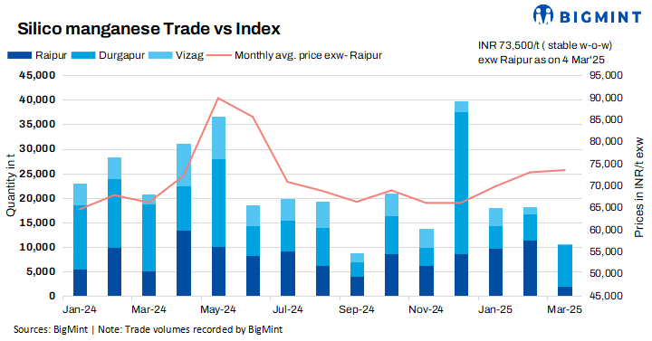 India’s domestic prices of 60-14 grade silico manganese were mostly stable with a slight w-o-w decline of INR 100/tonne (t) ($1/t) seen, at INR 72,200-73,600/t ($829-845/t) exw on 25 February 2025, as per BigMint’s assessment. The price stability stems from buyers’ resistance to higher quotes, leading to limited price movement and cautious market behaviour.