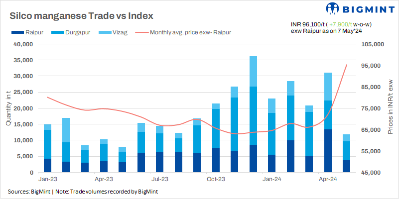 Hike in billet prices w-o-w: BigMint’s daily steel billet index was assessed at INR 45,400 /t ($511/t) (up by INR 1,600/t w-o-w) exw-Raipur on 8 May 2024, which reached an 11-month high from September 2023. This, in turn, impacted the price of silico manganese, a key alloying element in steel production.