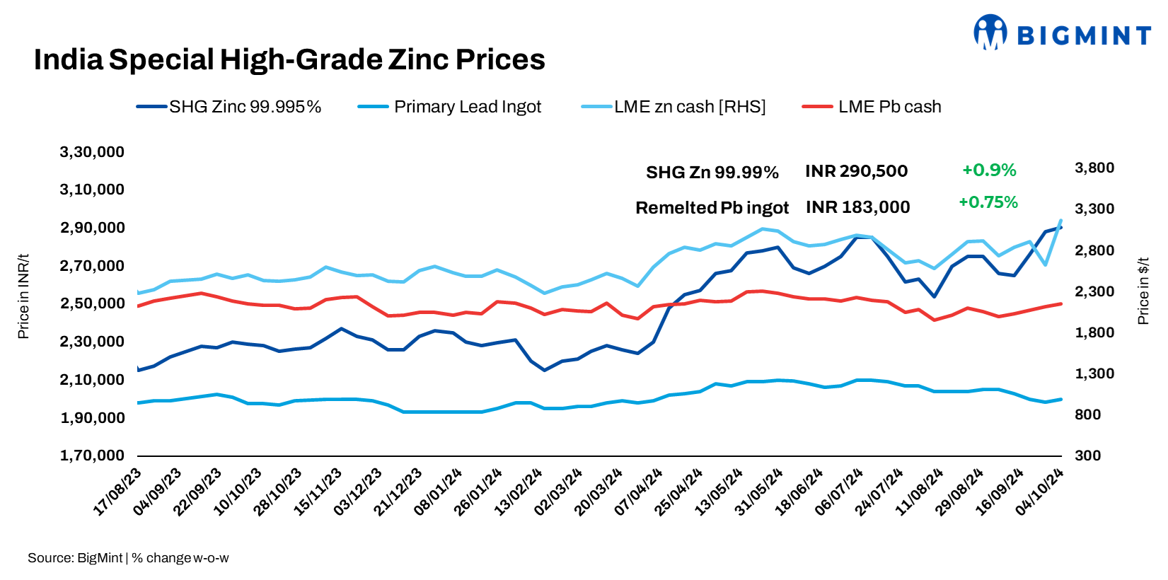 India’s domestic zinc and lead ingot prices increased by up to INR 2,500/t ($30/t) w-o-w, following a rise in LME futures of up to 3% and aligning with Hindustan Zinc Limited’s (HZL) price increase for zinc and lead by up to 6%. Zinc prices stood at INR 290,500/t ($3,459/t), while remelted lead ingot was assessed at INR 183,000/t ex-Delhi.
