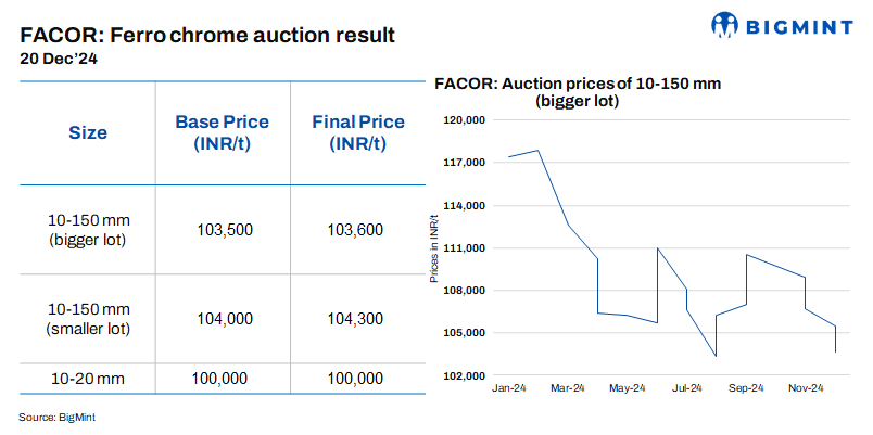 At Vedanta-FACOR’s ferro chrome auction today, the larger lot of 10-150 mm fetched an H1 price of INR 103,600/t exw, reflecting a decrease of INR 1,900/t from 2 Dec. Notably, bids have declined over the last 4 auctions since 30 Sep. The latest drop may be attributed to reduced bids at OMC’s recent chrome ore auction and weaker demand from China, driven by lower tender prices.