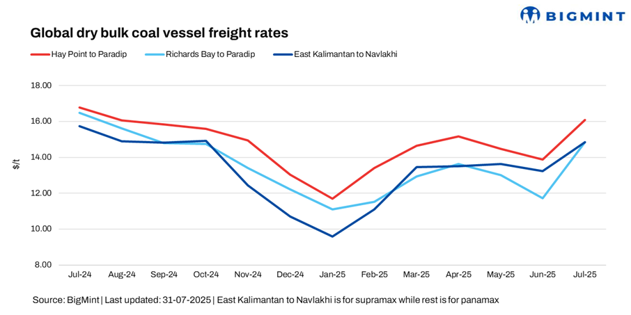 • Australia (Hay Point)-India (Paradip), Panamax: Freights from Australia to India decreased by $0.52/dry metric tonne (dmt) w-o-w, with BigMint’s latest assessment placing the Hay Point-Paradip route at $16.30/dmt. Monsoon rains continued to impact several regions of India, disrupting port operations, delaying cargo handling, and tightening vessel turnaround times. The weather-related interruptions led to congestion at select ports, limited loading/discharging windows, and affected freights — particularly for coastal movements. “Indeed, the monsoon continues to play a significant role in shaping the market. Conditions are softening now, and from what I understand, coal imports have slowed due to both the ongoing rains and current import policies. Starting next week, import volumes are expected to decline further and remain low through the end of August,” added a source.