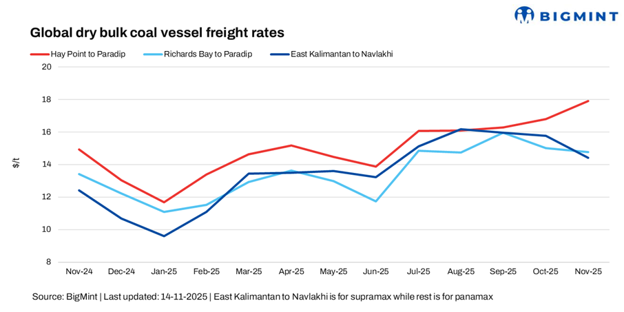 Rising bunker prices are adding upward pressure on dry bulk coal freight rates, as higher fuel costs directly increase operating expenses for vessel owners. “With marine fuel accounting for a significant share of voyage costs, owners are seeking to pass on these additional expenses through higher freight rates, especially on longer-haul routes such as Australia-India and South Africa-India”, a source told BigMint.