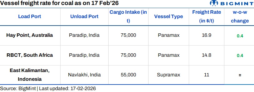 Dry bulk coal freights to India for Supramax and Panamax remained largely steady w-o-w, with marginal gains on select routes, supported by firm bunker prices and limited vessel supply. Overall fixture activity stayed weak due to subdued cargo enquiries and thin volumes. Indian Ocean activity remained muted, with cautious market participation and only one fixture reported on the Australia-India route.