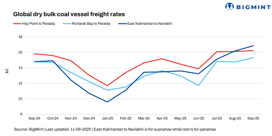 Dry bulk coal freights softened this week, with major routes coming under pressure on the back of weak demand-supply fundamentals, higher import offers, and limited fixture activity, as noted by market participants. Apart from a few Australia–China fixtures reported by SAIL, activity on key lanes such as South Africa–India and Indonesia–India remained muted.