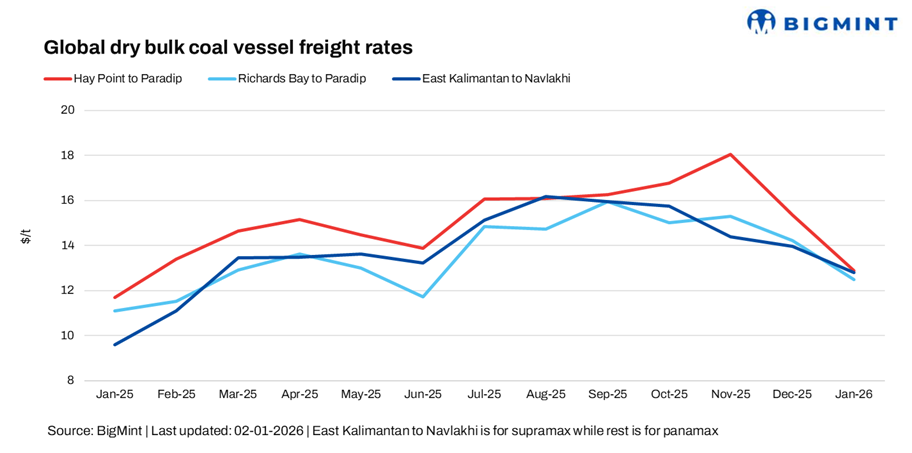 Dry bulk coal freight markets into India opened CY’26 on a weak footing, with rates across key import corridors coming under sustained pressure amid sluggish trading activity and a lack of demand support. Sparse fixing volumes, cautious chartering sentiment, and an overhang of prompt tonnage continued to weigh on freight levels, while falling bunker prices and softer FFA markets further reinforced the bearish tone. As a result, both Panamax and Supramax segments struggled to find a floor during the week, setting a subdued tone for the early part of the year.