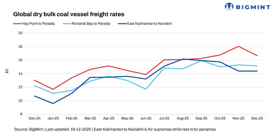 “The coal freight market has turned slightly bearish, as reduced cargo volumes across both the Pacific and Atlantic basins have weakened demand for tonnage. Slower fixing activity, cautious buying behaviour, and growing vessel availability have prompted owners to soften rate expectations, keeping freight sentiment under pressure despite stable port operations in some regions,” stated a major shipping giant to BigMint.