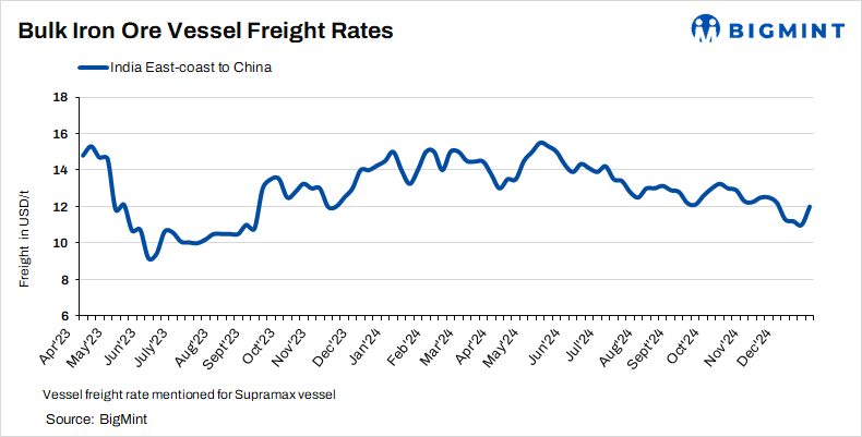 Dry bulk iron ore freight rates showed mixed trends this week, driven by recovery in import demand tied to China’s steel production and seasonal restocking. According to BigMint’s assessment, Asia-Pacific Supramax dry bulk freights (50,000-55,000 t) for iron ore shipments from the east coast of India to China increased $1/tonne (t) w-o-w to $12/t on 24 December.