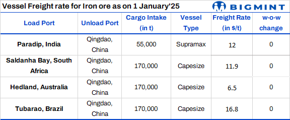 India’s iron ore vessel freights remained firm w-o-w due to limited new cargo inquiries during the holiday season and the absence of fixtures in the Indian market. Asia-Pacific Supramax dry bulk (50,000-55,000 t) freights for iron ore vessels from the east coast of India to China stayed unchanged w-o-w at $12/t on 1 Jan’25, as per BigMint’s assessment.