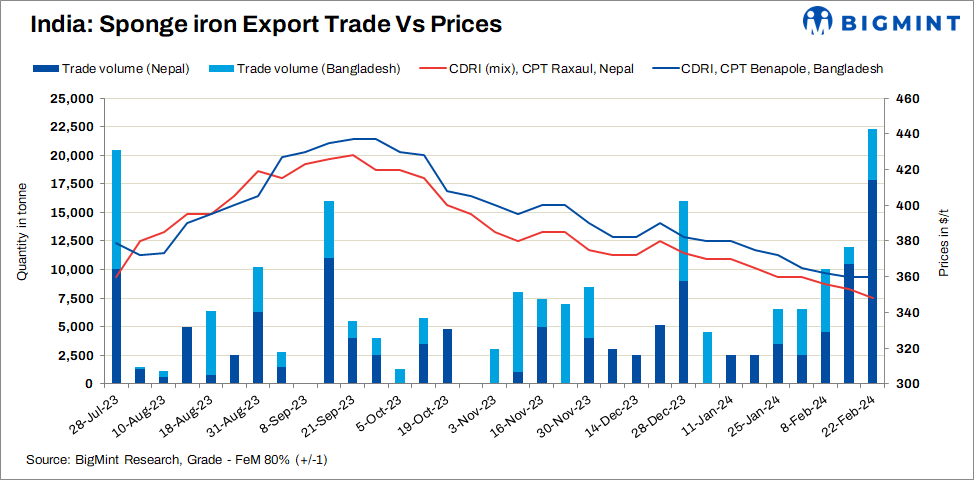 BigMint’s weekly price assessment dropped by $5 per ton to $348/t CPT Nepal (FeM 80%, 70% lumps, and 30% fines). Four rakes (10,300 t) sponge iron were sold at $320-325/t, loaded to wagons in east India, equivalent to $345-350/t CPT Nepal. Moreover, sources reported 7,500 t of PDRI (78-79% FeM) for Nepal by road at $290-292/t ex-mill in east India. Furthermore, approximately 4,500 t of sponge iron were sold to Bangladesh at around $360/t CPT Benapole.