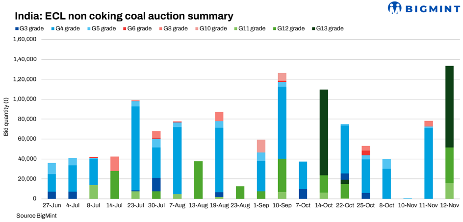CIL subsidiary Eastern Coalfields Ltd (ECL) sold a combined 270,550 t of non-coking coal across four auctions held on 8, 10, 11 and 12 November 2025, reflecting active interest in G4, G5 and lower-grade (G9-G13) coal. Auctions on 8 and 11 November drew the strongest participation, while the 10 November event was limited to a small G5 parcel. Overall sentiment appeared firm for G4 and mixed for G5, while low-grade coal such as G11-G13 saw large allocations at lower bid levels.