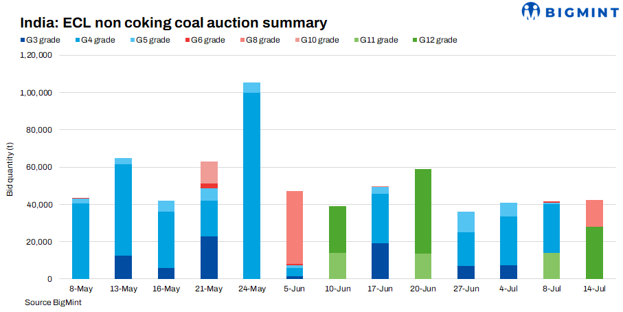 On 14 July, G/Begunia OC offered the largest lot with 36,300 t of G9 at INR 1,772/t, while Rajmahal OC supplied 28,050 t of G12 at INR 2,068/t. Smaller lots of G5 and G4 were auctioned from Barmuri OC, Madhaipur UG, and other mines.