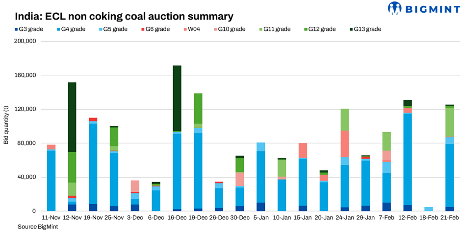 Eastern Coalfields Limited (ECL) conducted its non-coking coal auction on 21 February 2026, offering 1,147,600 t. Total allocated volume stood at 125,500 t, reflecting subdued participation against a sizeable notified quantity. The overall weighted average price settled at INR 4,767/t.