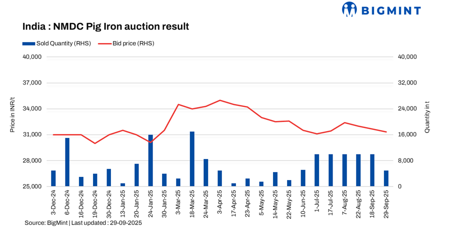 NMDC’s steel plant in Nagarnar, Chhattisgarh, auctioned 5,000 t of steel-grade pig iron on 29 Sep’25, with the entire quantity booked at an average price of INR 31,350/t (by road). However, management approval is still pending. Bids fell by INR 300/t from the previous auction on 18 Sep for 10,000 t, in which the entire quantity was booked at an average of INR 31,650/t (by road).