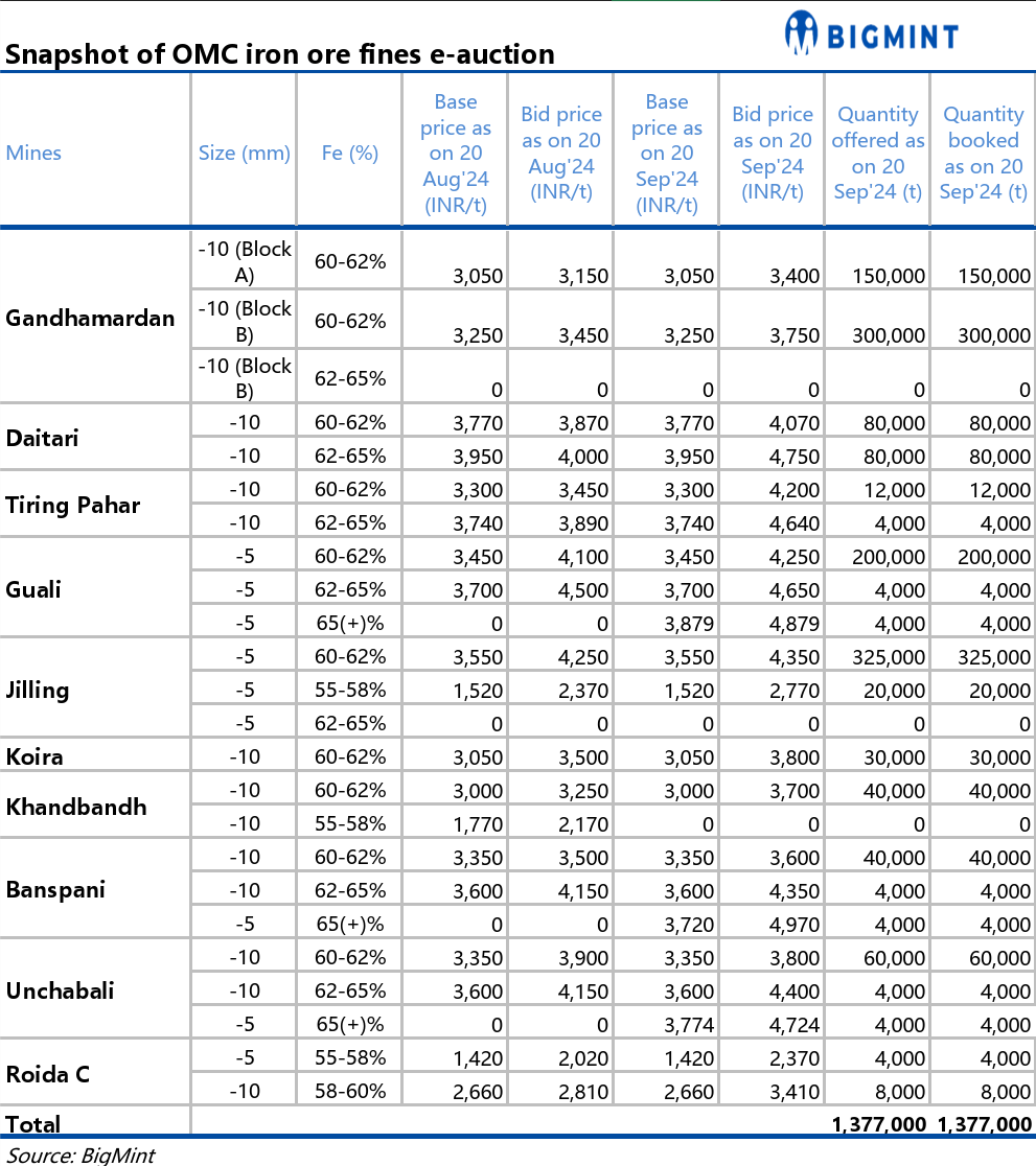 In OMC’s auction for 1.377 mnt of iron ore fines (Fe 54-65%) on 20 Sep’24, the entire quantity was booked at INR 2,370-4,970/t. Bids (weighted avg) increased around INR 275/t against last month. The auction received good response from steelmakers with bids fetching premium of INR 250-1,250/t against set base price owing to tight availability of high grade ore due to extended monsoons.