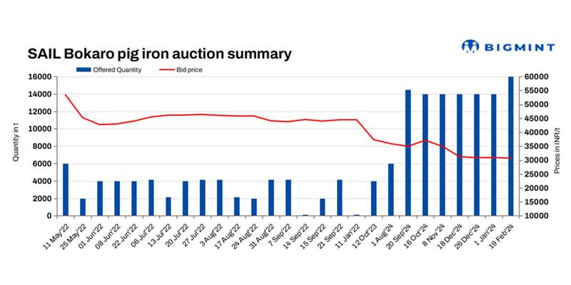 SAIL-Bokaro Steel Plant (BSL) held an auction for 17,500 t of steel-grade pig iron on 19 Feb’25. The total volume was booked at an average price of INR 30,700/t exw. In the previous auction on 1 Jan’25, 14,000 t of steel-grade pig iron – the entire quantity on offer – were sold at an average price of INR 31,350/t exw.
