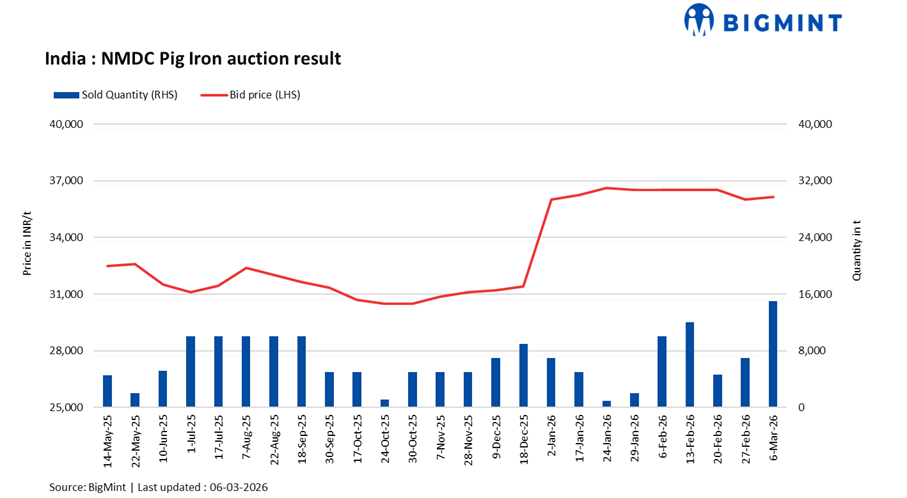 NMDC Limited’s Nagarnar Steel Plant auctioned 15,000 t of steel-grade pig iron on 6 Mar’26, with the entire volume booked at an average INR 36,150/t. Prices increased by INR 150/t from the 27 Feb auction, when only 7,000 t of the 12,000 t offered were sold at INR 36,000/t. The results point to selective buying interest amid cautious market sentiment and uncertain finished steel demand.