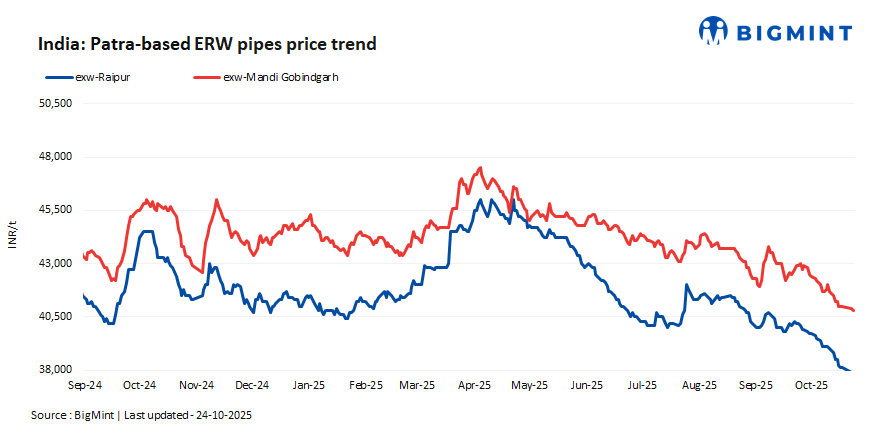 In India, ERW patra pipe (41-60 OD) prices declined w-o-w in both Raipur and Mandi Gobindgarh post Diwali holidays. Demand remained low as market participants were away during Diwali. Prices saw a drop of INR 300/tonne (t) d-o-d in Raipur and INR 100/t d-o-d in Mandi Gobindgarh on 24 October 2025.