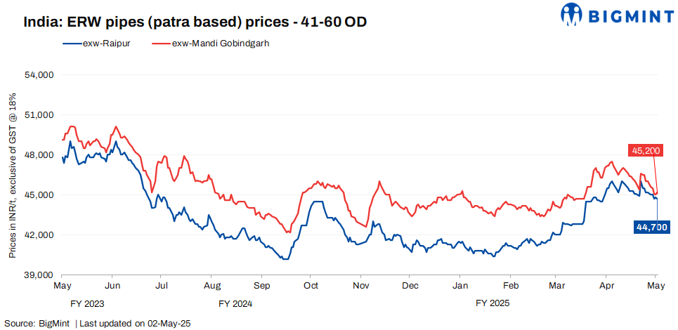 ERW patra pipe (41-60 OD) prices showed a downtrend w-o-w in Raipur and Mandi Gobindgarh. Raipur prices dropped by INR 500/tonne (t) w-o-w, and by INR 800/t w-o-w in Mandi.