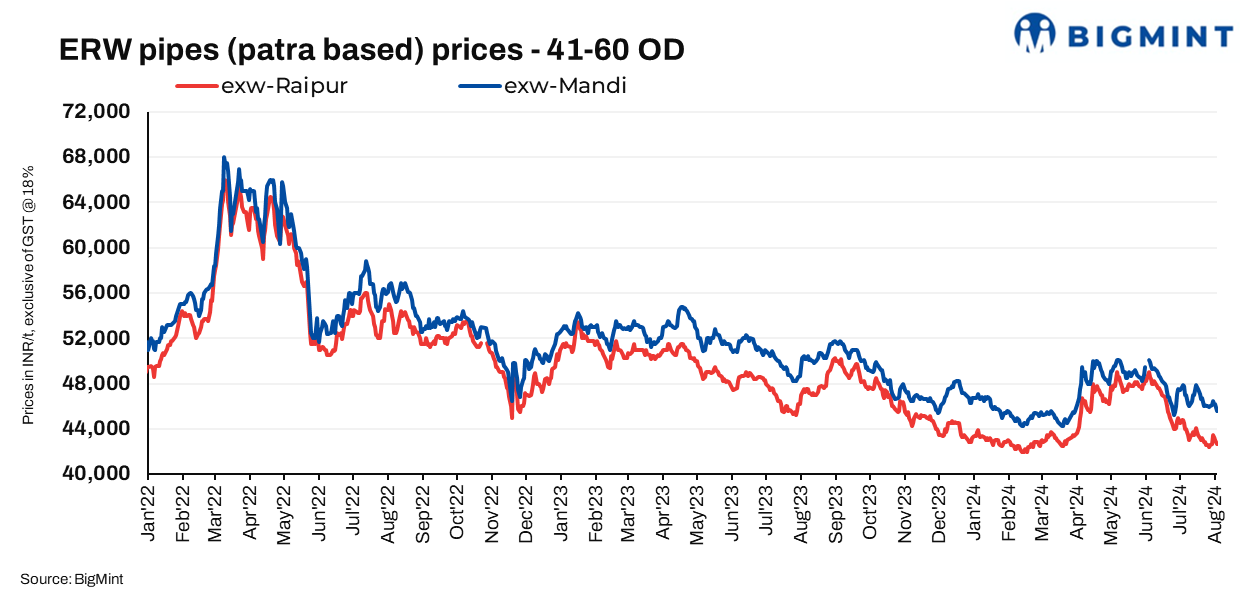 ERW patra pipes price dropped INR 1,000/t w-o-w in key markets of Mandi Gobindgarh and Raipur on 9 Aug’24. Current base-grade patra (148-200mm, 2mm thick) prices are at INR 44,600/t exw-Mandi and INR 41,700/t exw-Raipur. Prices exclude 18% GST. Prices saw a reduction owing to weakening demand for finished steel and decreasing raw material prices.