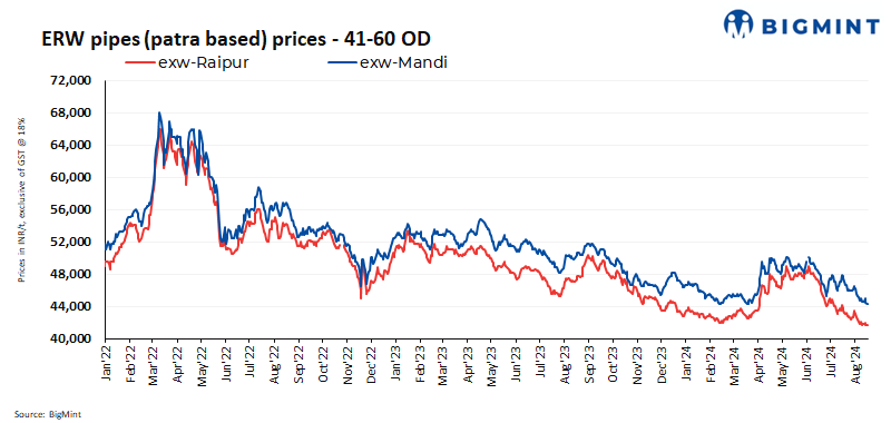 ERW patra pipes price inched down by INR 300/t w-o-w in Mandi Gobindgarh, Punjab, while prices in Raipur, Chhattisgarh, remained stable w-o-w. Base-grade patra (148-200mm, 2mm thick) prices are at INR 44,300/t exw-Mandi and INR 41,700/t exw-Raipur on 16 Aug’24. Prices exclude 18% GST. Prices dropped amid decline in finished steel demand and declining raw material prices.