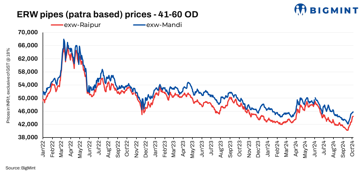 ERW patra pipe (41-60 OD) prices rose w-o-w in both Raipur and Mandi Gobindgarh amid a surge in raw material prices and improved demand for finished steel in both markets. However, prices remained stable d-o-d on 4 October 2024 in Raipur and Mandi Gobindgarh. Current steel prices are INR 44,500/t at Raipur and INR 45,800/t in Mandi Gobindgarh. Listed prices are ex-works (exw), excluding 18% GST.