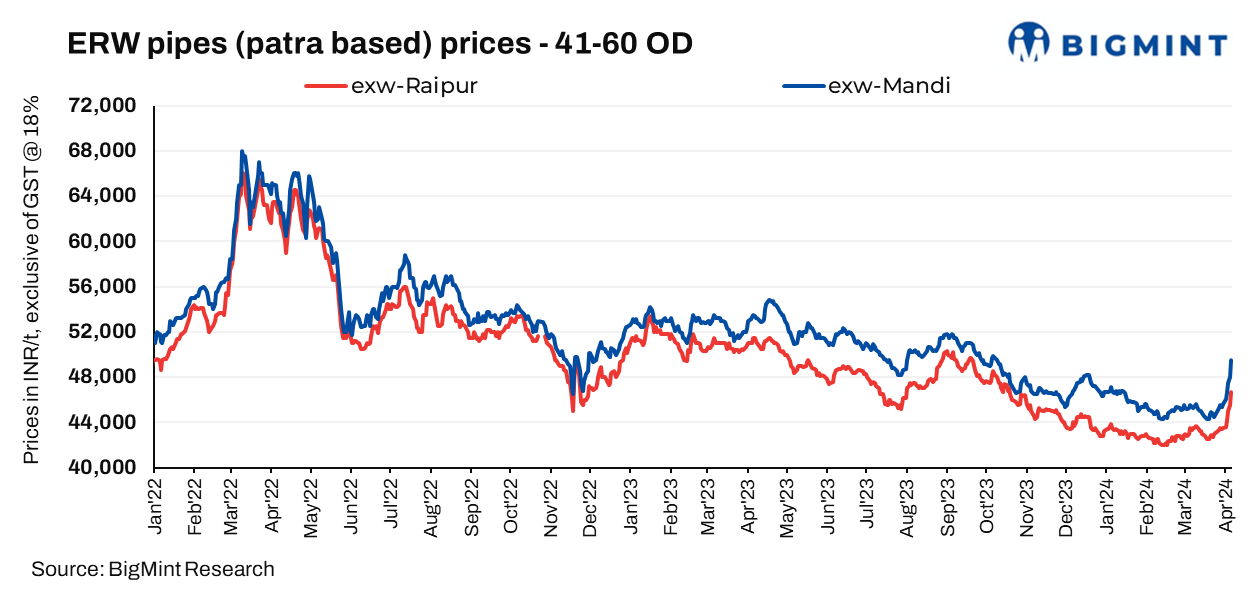ERW patra pipe (41-60 OD) prices rose w-o-w in both Raipur and Mandi Gobindgarh amid good demand for finished steel in both the markets. In addition, prices saw an increase of INR 1,200/tonne (t) d-o-d on 5 April 2024 in Raipur and of INR 1,500/t in Mandi Gobindgarh.
