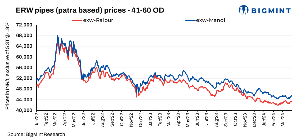 ERW patra pipe (41-60 OD) prices increased w-o-w in both Raipur and Mandi Gobindgarh despite slowdown in demand, mainly due to increasing raw material prices. However, prices dipped INR 100/tonne (t) d-o-d today in both Raipur and Mandi Gobindgarh.