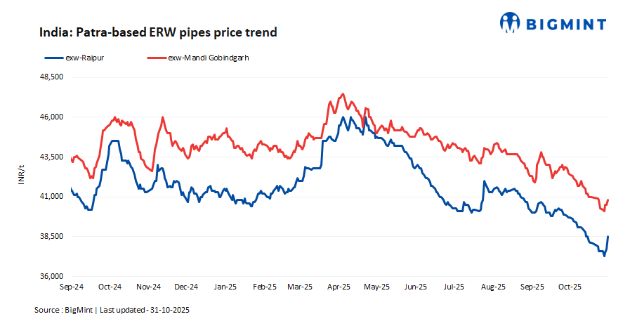 In India, ERW patra pipe (41-60 OD) prices rose w-o-w in both Raipur and Mandi Gobindgarh on improved trade activities fuelled by strong demand for finished steel post-Diwali and rising raw material costs. Prices saw an increase d-o-d by INR 800/tonne (t) in Raipur and INR 300/t in Mandi Gobindgarh on 31 October 2025.