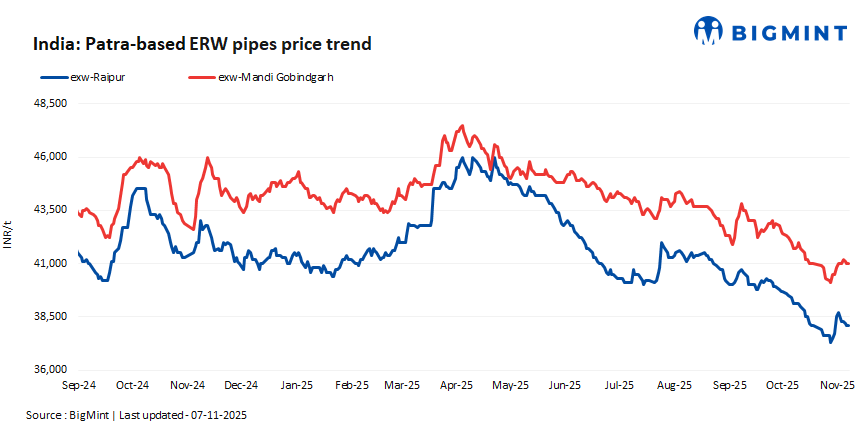 Raipur: Prices dropped by INR 400/t w-o-w to INR 38,100/t exw-Raipur on 7 November 2025 as compared to INR 38,500/t on 31 October. Trading remained sluggish, as buyers focused only on essential, need-based purchases. Deals for about 800 t were recorded in patra-based pipes this week.