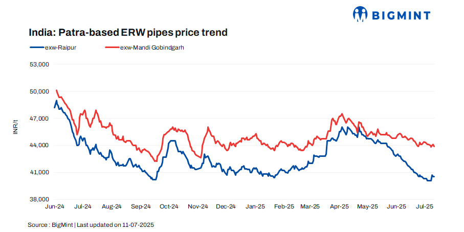 ERW patra pipe (41-60 OD) prices showed mixed trends w-o-w in Raipur and Mandi Gobindgarh amid slow demand and weak market sentiments.