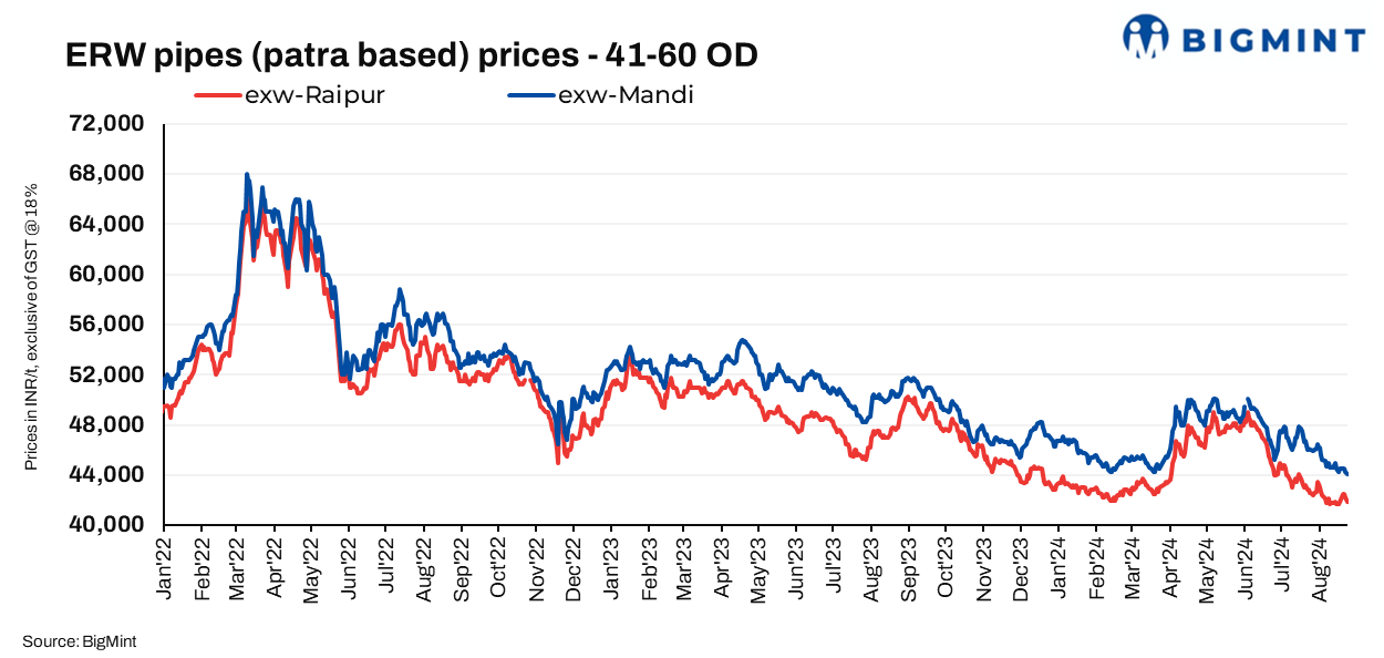 ERW patra pipe (41-60 OD) prices showed a mixed trend w-o-w in both Raipur and Mandi Gobindgarh. Raipur saw a slight increase in pipe prices this week, while in Mandi prices fell compared to the last week. However, demand for ERW patra pipes weakened in both markets compared to the last week. In addition, prices dropped by INR 300/t d-o-d in Raipur and INR 200/t in Mandi Gobindgarh on 23 August.