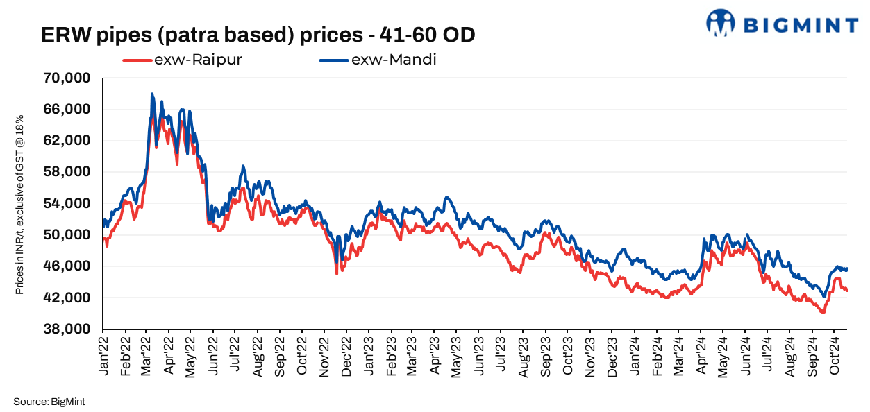 On a d-o-d basis, ERW patra pipe prices rose by INR 200/t to INR 45,700/t in Mandi Gobindgarh and declined by INR 200/t to INR 42,900/t in Raipur on 18 October. Listed prices are ex-works (exw), excluding 18% GST.