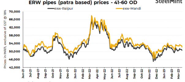 ERW patra pipe (41-60 OD) prices inched down by INR 300/t ($4/t) d-o-d in the key markets of Mandi Gobindgarh and Raipur today, sources informed SteelMint. Current offers-