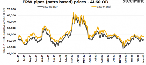 ERW patra pipe (41-60 OD) prices fell by INR 300/t ($4/t) d-o-d in Mandi Gobindgarh while prices remained unchanged in Raipur today, sources informed SteelMint. Current offers are: