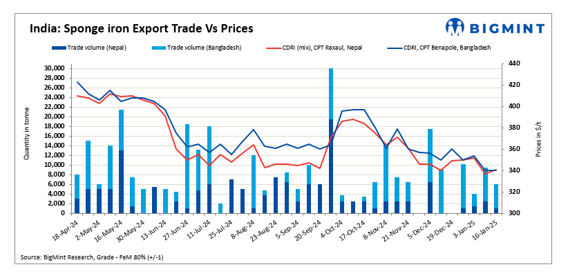 India’s sponge iron export offers for Nepal increased by $4/t w-o-w to $341/t CPT Raxaul, while prices for Bangladesh remained firm w-o-w at $340/t CPT Benapole, shows BigMint’s weekly assessment. Prices for Nepal rose despite buying from neighbouring markets being limited due to global economic uncertainties. Approximately 6,000 t of sponge iron were sold, with shipments destined for both Nepal and Bangladesh.
